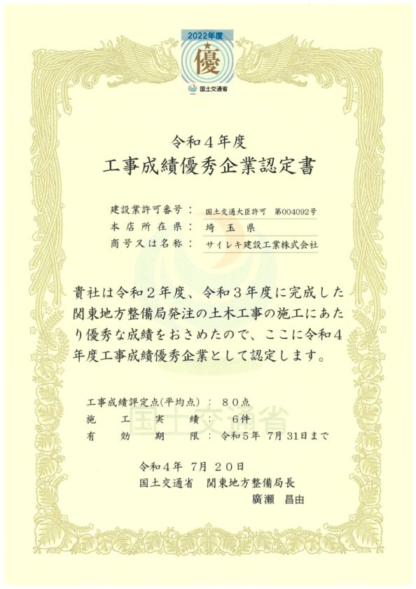 新技術活用・生産性等向上工事表彰を受賞しました。 投稿日 2022年7月23日 更新日 2022年8月6日 著者 サイレキ建設工業(株) カテゴリー お知らせ 国交省関東地方整備局荒川上流河川事務所様より、R2都幾川左岸石橋仮置土整備工事(本多幸浩)が新技術活用・生産性等向上工事表彰を受賞しました。
